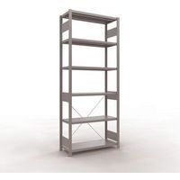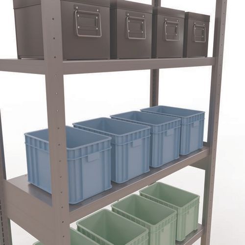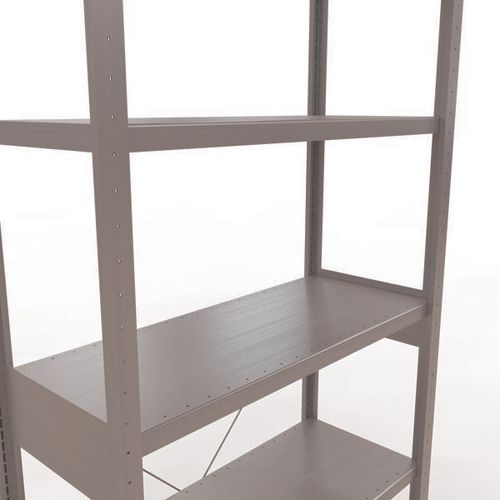 Robust warehouse shelving with a galvanised finish that is highly resistant to damp environments. Sheet-steel solid shelves that can hold goods of various sizes. Industrial shelving is easy and quick to assemble by slotting the parts together and does not require the use of any particular tools. Shelving is easy to extend by adding 1 or more add-on units. Distance between perforations: 25 mm. Height of the first perforation: 50 mm.