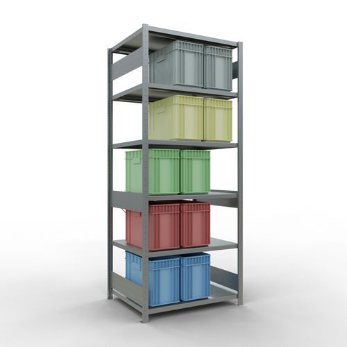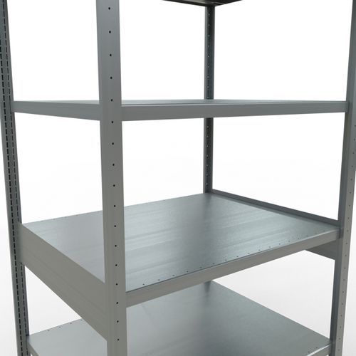Robust warehouse shelving with a galvanised finish that is highly resistant to damp environments. Sheet-steel solid shelves that can hold goods of various sizes. Industrial shelving is easy and quick to assemble by slotting the parts together and does not require the use of any particular tools. Shelving is easy to extend by adding 1 or more add-on units. Distance between perforations: 25 mm. Height of the first perforation: 50 mm.