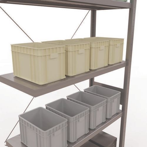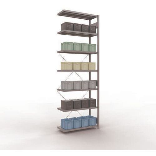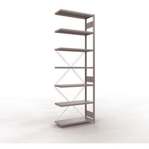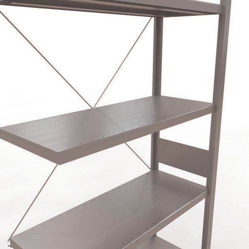 Robust warehouse shelving with a galvanised finish that is highly resistant to damp environments. Sheet-steel solid shelves that can hold goods of various sizes. Industrial shelving is easy and quick to assemble by slotting the parts together and does not require the use of any particular tools. Shelving is easy to extend by adding 1 or more add-on units. Distance between perforations: 25 mm. Height of the first perforation: 50 mm. Height of the first perforation: 22.5 mm.