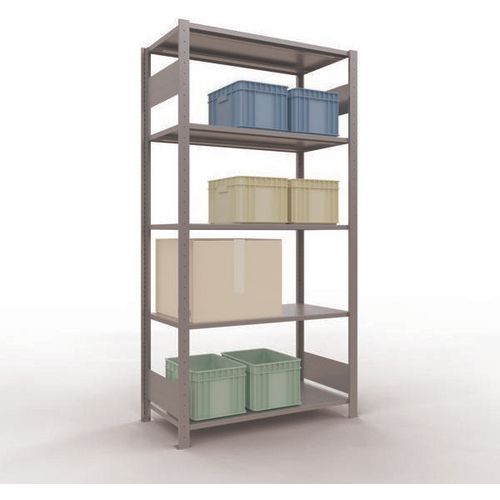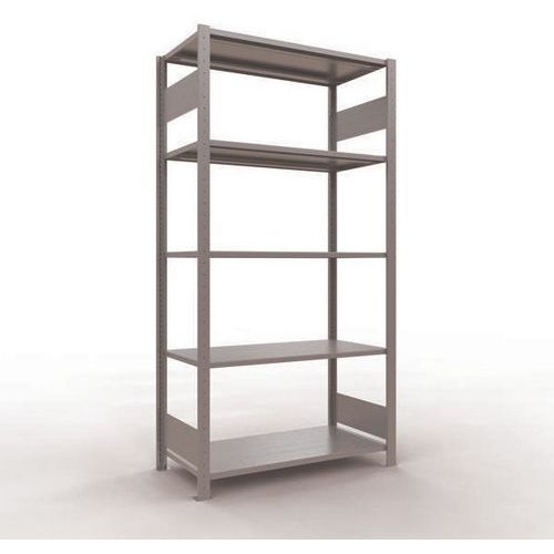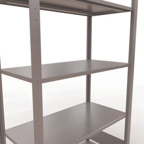Robust warehouse shelving offering access from two sides and with a galvanised finish that is highly resistant to damp environments. Sheet-steel solid shelves that can hold goods of various sizes. Industrial shelving is easy and quick to assemble by slotting the parts together and does not require the use of any particular tools. Shelving is easy to extend by adding 1 or more add-on units. Distance between perforations: 5 mm. Height of the first perforation: 22.5 mm.