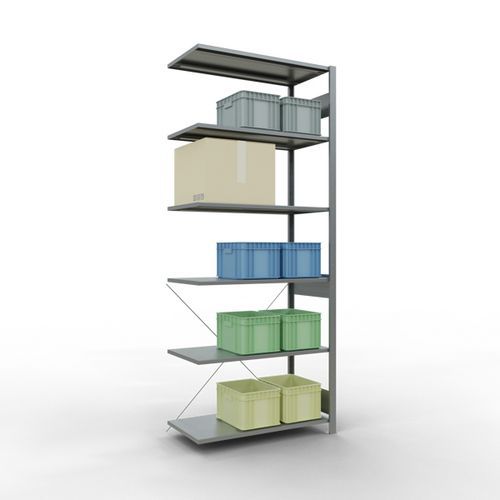 Robust warehouse shelving with a galvanised finish that is highly resistant to damp environments. Sheet-steel solid shelves that can hold goods of various sizes. Industrial shelving is easy and quick to assemble by slotting the parts together and does not require the use of any particular tools. Shelving is easy to extend by adding 1 or more add-on units. Distance between perforations: 25 mm. Height of the first perforation: 50 mm.