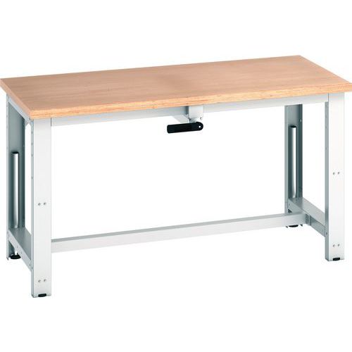 Height adjustable and ergonomic workbench with two choices of worktop and hand-crank operation.