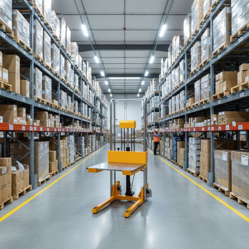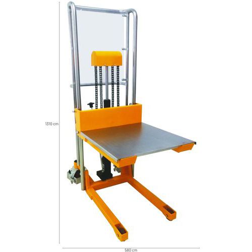 - Manual hydraulic pallet stacker, suitable for lifting bins or pallets to working height.