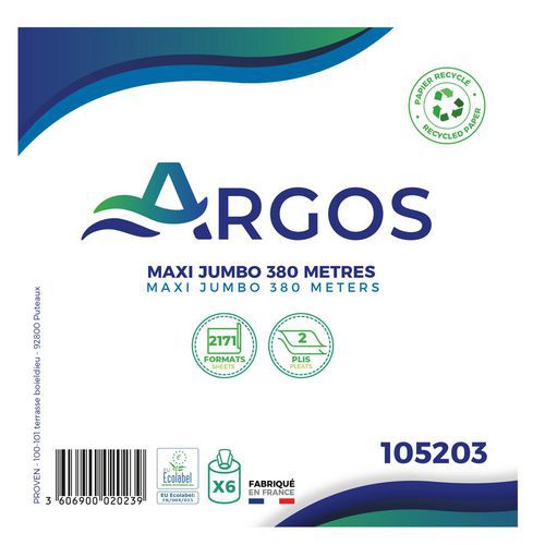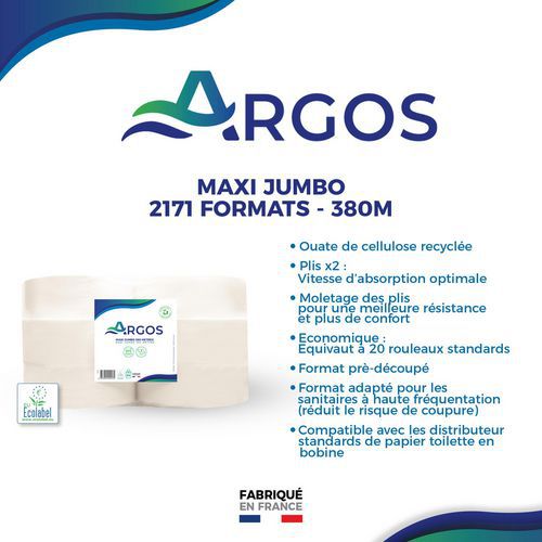 These rolls of toilet tissue are made from 100% cellulose wadding. Recycled. Two-ply for improved absorption. The two layers of tissue are embossed for added comfort and resistance. Packaged in bags to eliminate the need for cardboard boxes, significantly reducing waste and handling times. Number of sheets: 2171 per roll.