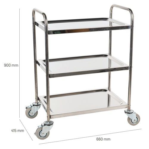 | Product Name | Medical Stainless Steel Trolley, Load capacity: 100 kg, O/A height: 900 mm, O/A width: 415 mm |