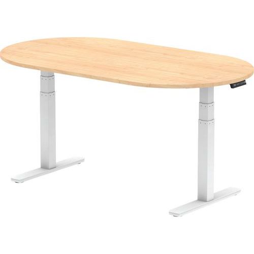 Impulse height adjustable boardroom table. 25mm thick top. The legs are powder-coated in an attractive silver colour. 2mm ABS protective edging. The tough melamine finish resists heat damage. Steel to steel fittings.