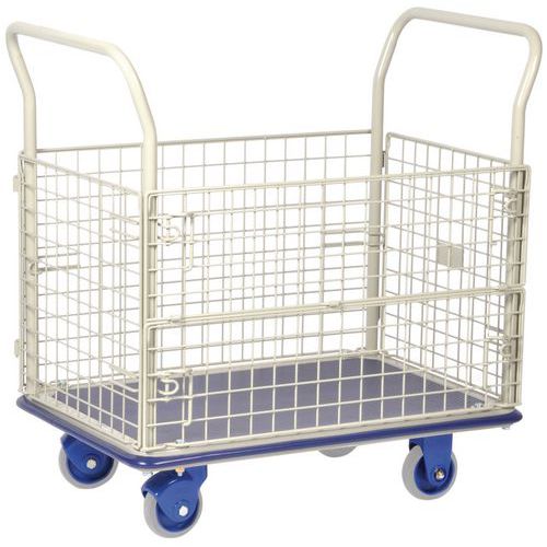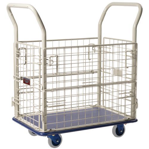 Anti-slip platform trolley with removable surrounding mesh sides and non-marking wheels.