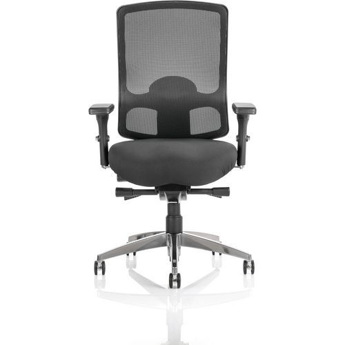 High-density cold cure foam seat. Full Mesh backrest. Synchronized tilt mechanism with anti-shock function. Seat angle adjustment. Seat slide. Height adjustable lumbar support. Weight tilt tension control. Height adjustable arms with soft PU multi-functional sliding arm pads. The chrome 5-star base with castors allows the chair to easily move to where it is needed.