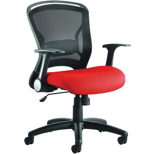 Breathable mesh backrest with a fixed lumbar support pad. Soft moulded twin cushion seat design with stitch detail. Single lever lock tilt mechanism. Weight tilt tension control. Folding arms as standard. Nylon five-star base. Robust castors allow the chair to be moved to where it is most needed.