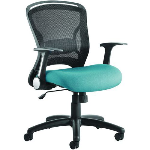 Breathable mesh backrest with a fixed lumbar support pad. Soft moulded twin cushion seat design with stitch detail. Single lever lock tilt mechanism. Weight tilt tension control. Folding arms as standard. Nylon five-star base. Robust castors allow the chair to be moved to where it is most needed.