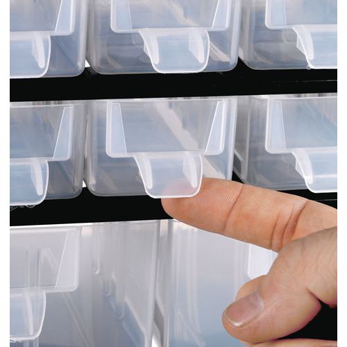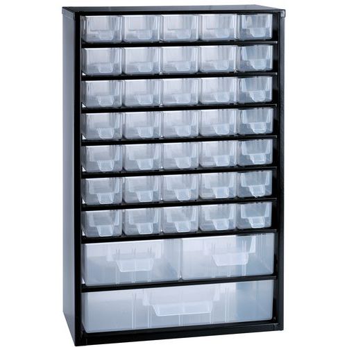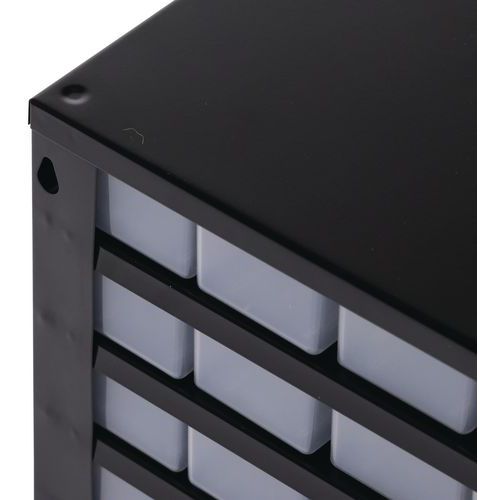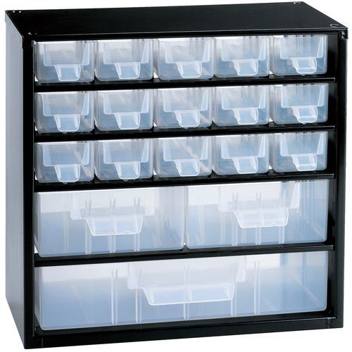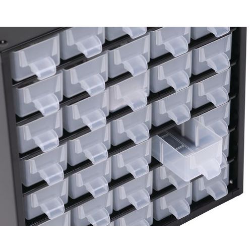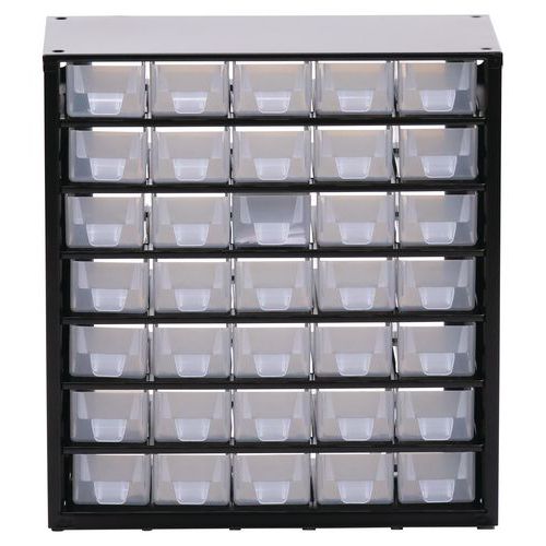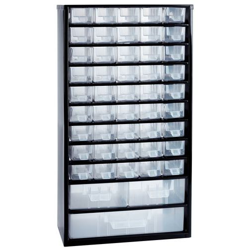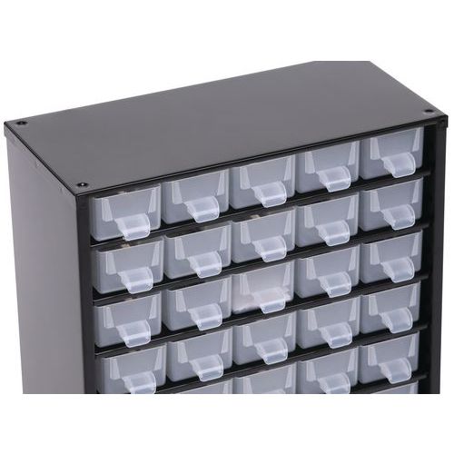 Metal cabinet with transparent plastic drawers. Ideal for storing, sorting and organising small parts. Store your items neatly and protect them from dust.