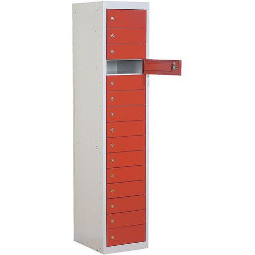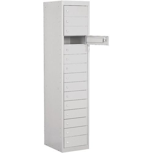 A locker with 15 compartments but one door gives a user a great deal of centralised control of the contents.