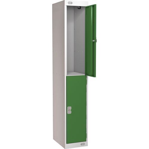 Epoxy-polyester powder-coated body to resist scuffs and scrapes and reduce harmful bacteria. Double coat hooks in both compartments. The cylinder lock uses in-frame locking to provide added security and has two keys. All hasp locks allow a locker to be locked with a padlock, making it ideal for lockers with multiple users, such as in gyms or leisure facilities. All-round reinforced edges improve strength and rigidity. Door stiffeners for added security. Ventilation slots at the top and bottom aid in air circulation. Integrated plastic number holder. Riveted/welded cold-rolled mild steel construction. Pre-drilled fixing holes for bolting lockers together, allowing you to form stacks and nests to suit your needs. Conforms to the requirements of the British Standard for Clothes Lockers BS4680:1996 “Standard Duty”. 1-year guarantee. This product has been finished with ActiveCoat - a hard wearing, anti-bacterial powder coating with a 99.9% reduction of e-coli and MRSA super-bug bacteria, suiting even the most stringent hygienic environment.