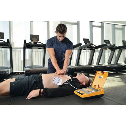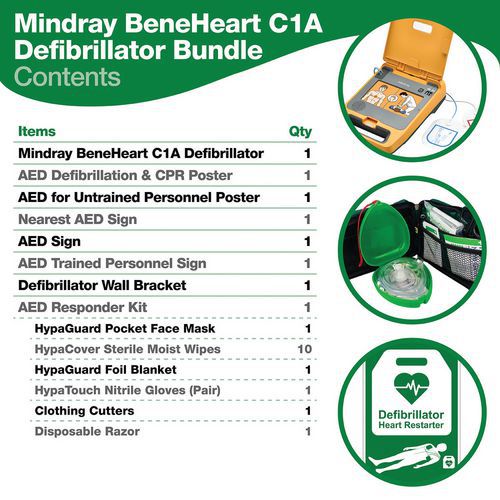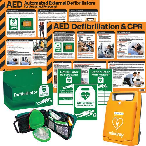 - Comprehensive AED station including AED, responder kit, posters, signs and two wall brackets.