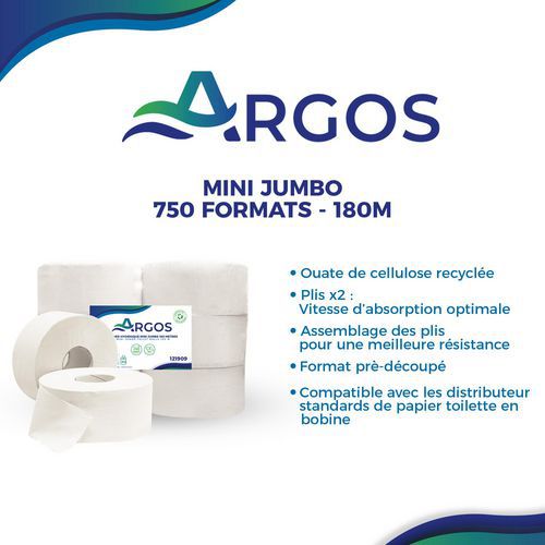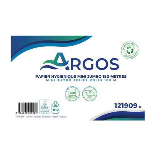 These rolls of toilet tissue are made from 100% cellulose wadding. Recycled. Two-ply for improved absorption. The two layers of tissue are embossed for added comfort and resistance. Packaged in bags to eliminate the need for cardboard boxes, significantly reducing waste and handling times. Number of sheets: 750 per roll.