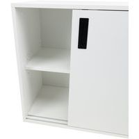 Cabinet with 18-mm melamine sliding doors with 1-mm ABS edges. 25-mm shelf able to hold a load of up to 32 kg. Plastic feet for levelling your cabinet. 60-mm metal handle. Key lock.