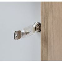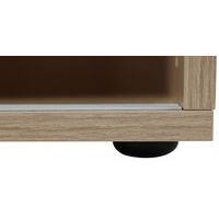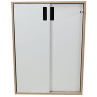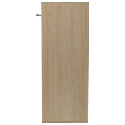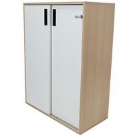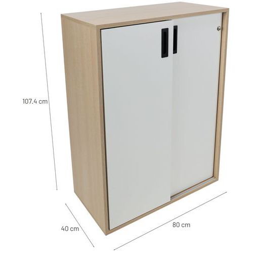 Cabinet with sliding doors made from melamine with ABS edges. Plastic feet keep the cabinet level and stable. Doors secured using a key lock. Each door has a fixed metal handle at the top. Cabinet has a lovely finish and is ideal for offices. Easy to move as mounted on castors. Handle height 60 mm. Useful width per door: 37.3 cm.