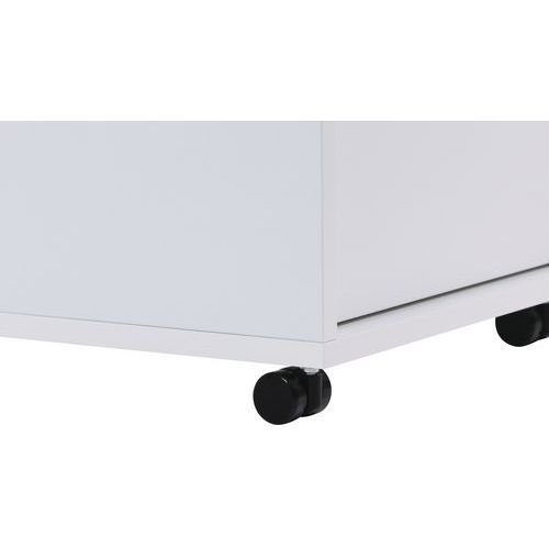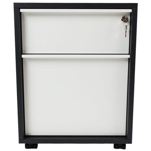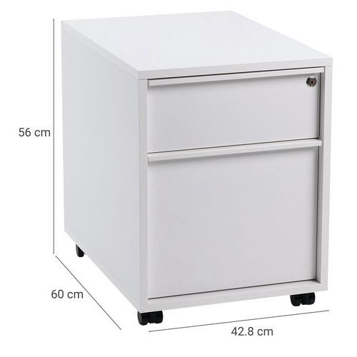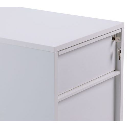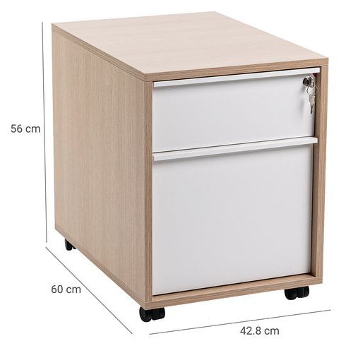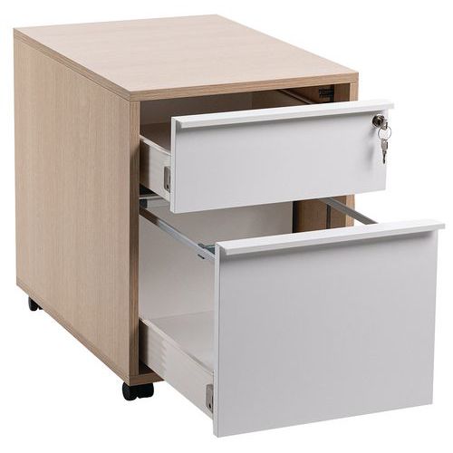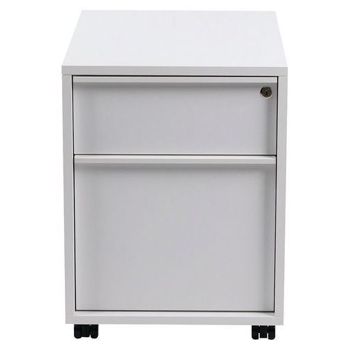 Misao melamine mobile cabinet with 1-mm edges. Two melamine-board drawers, including one for suspension files. The useful heights of the drawers are 14.5 cm and 27.7 cm, with a useful width of 32.5 cm. Suspension file drawer suitable for A4 and foolscap files. Central locking without anti-tilt mechanism.