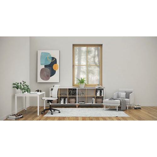 Straight desk with height-adjustable legs. 25-mm melamine worktop and 2-mm ABS edge. Two supporting crosspieces made from 40x20-mm metal tube. Straight metal legs, 40x40 mm, with plastic levelling feet. Worktop comes with a cable management system with flap.