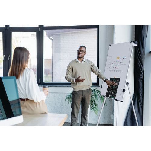 Write on the paper roll or directly on the board, post items on the board with magnets, and post paper sheets on the extensible arms with magnets to brainstorm and present ideas.