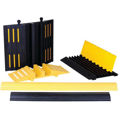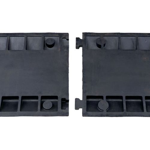 Modular channel cable duct with protective cover. Simple and safe assembly of modules with snap-on tabs. Solid, black rubber material with robust PE cover. Mass-dyed rubber: resistant to the cold and intense traffic. Profiled channel for perfect gliding of vehicles as they pass over.