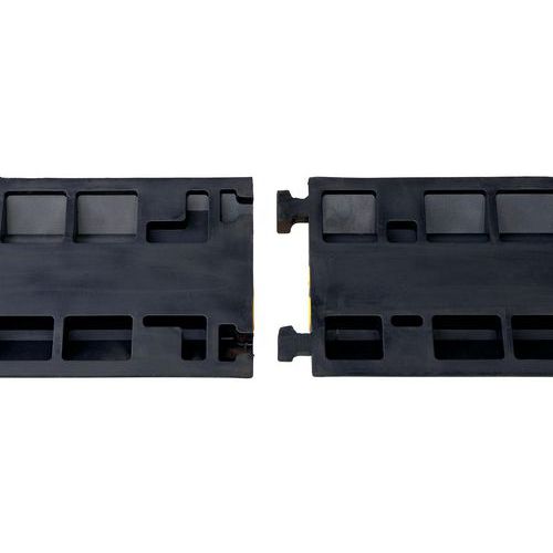 Modular channel cable duct with protective cover. Simple and safe assembly of modules with snap-on tabs. Solid, black rubber material with robust PE cover. Mass-dyed rubber: resistant to the cold and intense traffic. Profiled channel for perfect gliding of vehicles as they pass over.