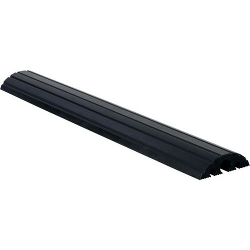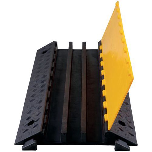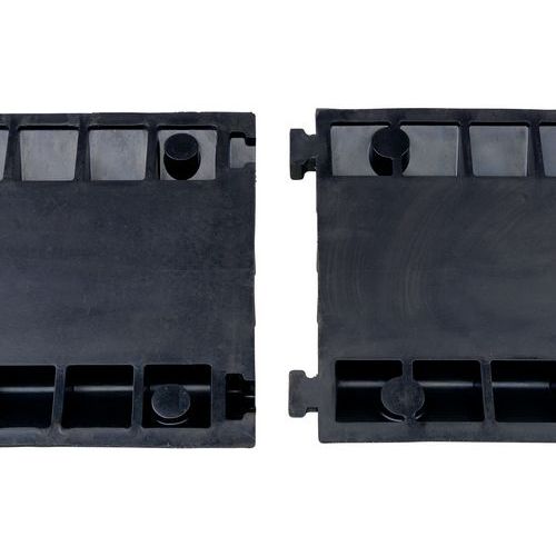 Modular channel cable duct with protective cover. Simple and safe assembly of modules with snap-on tabs. Solid, black rubber material with robust PE cover. Mass-dyed rubber: resistant to the cold and intense traffic. Profiled channel for perfect gliding of vehicles as they pass over.