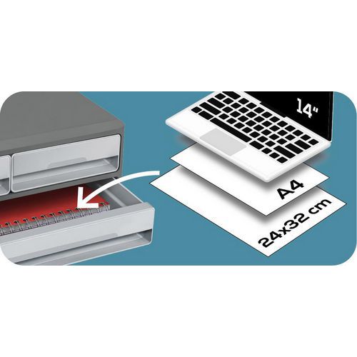 One large drawer for documents up to 24x32 cm in size, a tablet or laptops up to 14.