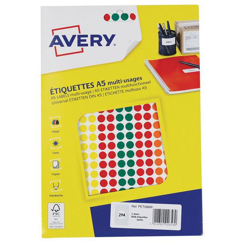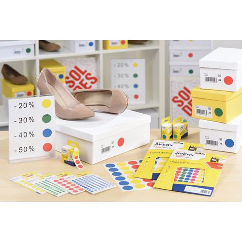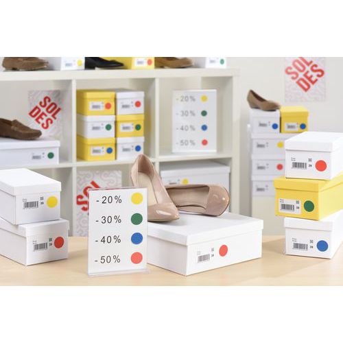 Compatible with all laser and ink printers. Suitable for marking, identifying, sorting, coding and labelling at a glance. Several colours and sizes. Permanent adhesive.