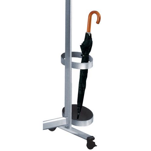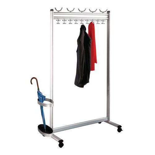 Superior quality very high capacity aluminium coat rack. Hanging rail equipped with hooks for hats and garments. The coat rack is mobile thanks to the 4 castors, which can be individually locked. The umbrella stand can be added as you wish on the right or left-hand side.
