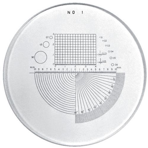 Includes: 1 linear scale with 0.1 mm graduations over 20 mm in length, angles, bores, radius diameters and a grid pattern.