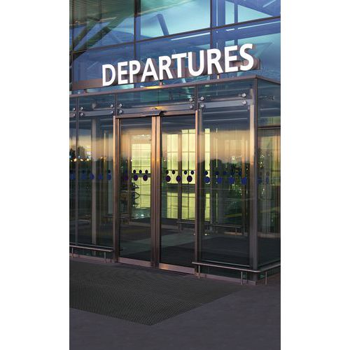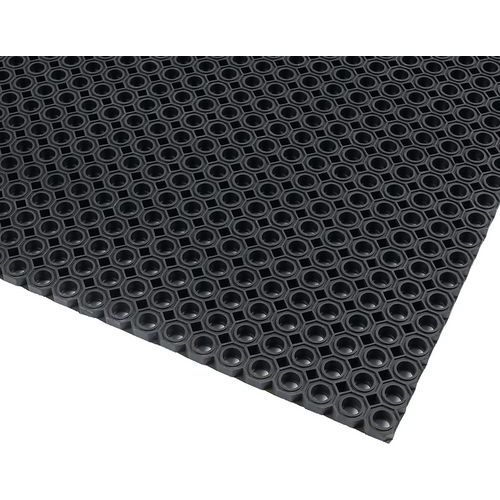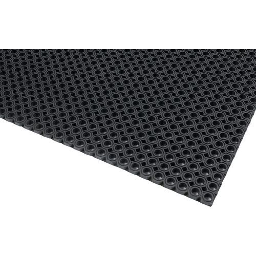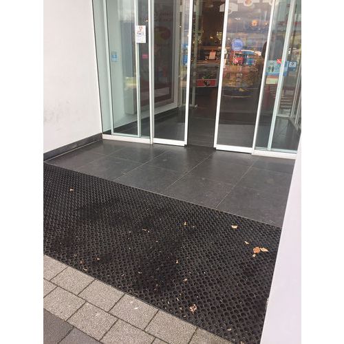 Oct-O-Flex™ traditional octagonal rubber outdoor mat, moderate thickness of 12 mm. Small, EU-compliant drainage holes for public entrances, smooth surface accessible for wheels. For impeccably clean shoes, with sole scraping function and high retention of collected dirt. Guaranteed hard-wearing, highly weather-resistant natural rubber material. Perfect drainage with raised knobs under the mat to facilitate draining.