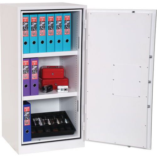 Provides 30 minutes of fire protection for paper records at 500°C. Choose between a key lock or an electronic lock with dual control, master code & time delay. Supplied with height adjustable shelves, including hanging rails for lateral files as standard. The high-security three-way espagnolette bolt work provides great strength and attack resistance. Ready prepared for floor fixing, with fixing bolts for concrete supplied. Finished in a high-quality scratch-resistant White paint RAL9003. Tested to the prestigious European S1 Security standard EN14450, giving cash cover of £2,000 or valuables cover of £20,000. Suitable for storage of controlled drugs whose active ingredients do not exceed 500 grams.