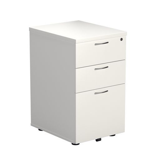 A secure three-drawer filing cabinet that is ideal for going under a desk.