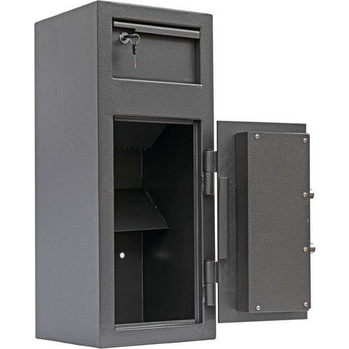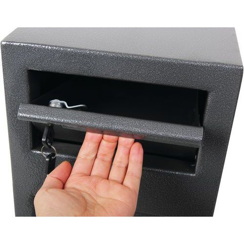 Fitted with a lockable deposit slot (2 keys supplied) 95H x 185W x 200D with a tilting baffle plate to ensure that the contents cannot be ‘fished out’.