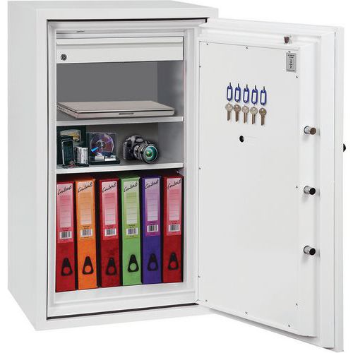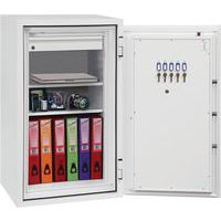 Each safe comes complete with height adjustable shelf, lockable cash/valuables drawer and three key hooks. Fitted with automatic 'slam shut' door locking. The lock is an R3 high-security user-friendly electronic lock with clear LED display. The lock has dual control, hidden code and scrambled code options. Takes 4-16 digit codes. 2-year warranty & free lifetime 'after the fire' replacement warranty. Supplied with fixing bolts for concrete. Fire Protection (Digital Media) – Tested to MTC – DIP120 – 60DM fire test standard, providing 60 minutes fire protection for digital media, DVD’s, USB memory stick and hard drives. Fire Protection (Paper) - providing up to 90 minutes of fire protection. Security Protection – Recommended for an overnight cash risk of £2,500.00 or £25,000.00 valuables. Drop Test – Fire and impact tested from 9.1 metres for resistance to the impact of falling through the burning floors of a building. 4 x AAA batteries required.