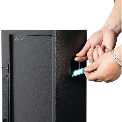 Adjustable key hooks, a spring-loaded door and a key deposit slot all allow keys to be deposited without the need to open the safe.