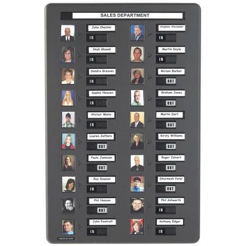 Friendly staff recognition in/out boards for improved security and safety.