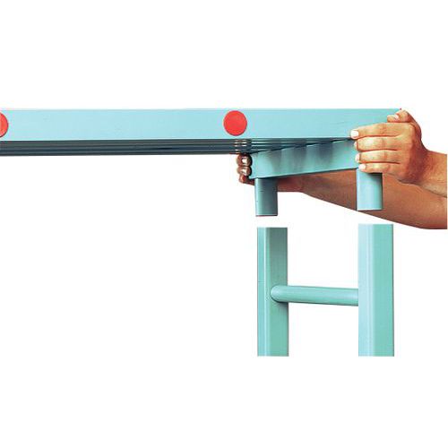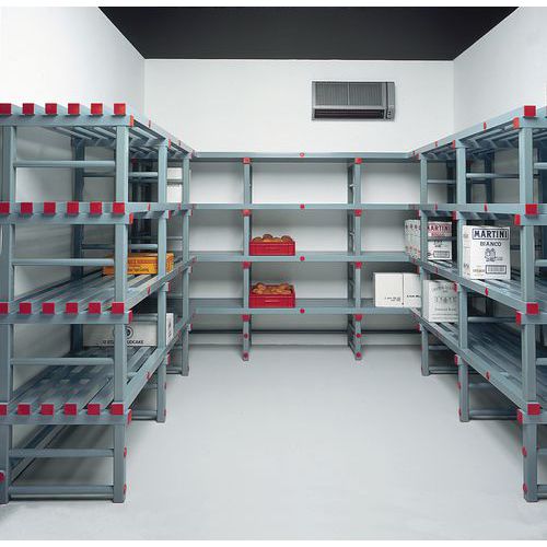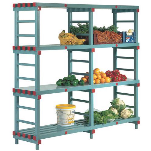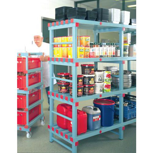 Open shelving for foodstuffs: good air circulation. Rounded edges to help protect stored products. Made from highly resistant, impact-proof, synthetic material. Resistant to salt and acids from foodstuffs. Easy to assemble without tools and simple to keep clean for optimum hygiene. Rounded profile (50 x 50 mm).