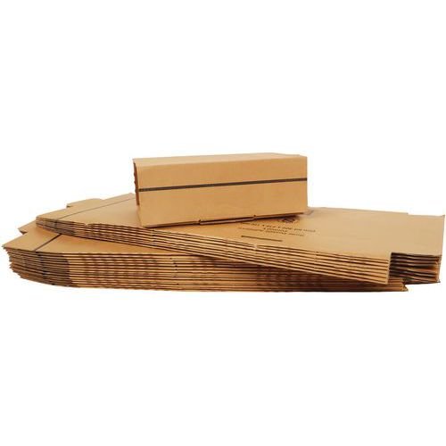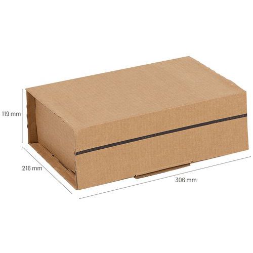 Postal box with secure closure thanks to its adhesive tape and its reinforcement tabs on the sides. Ready to use and no additional adhesive tape required. Single-wall cardboard box, easy to assemble.