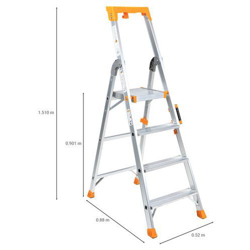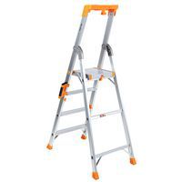 Multi-purpose tool shelf. Reinforced aluminium frame. Non-slip treads. Easy to carry and store. Complies with EN 131 and GS TUV Rheinland regulations. 10-year guarantee.