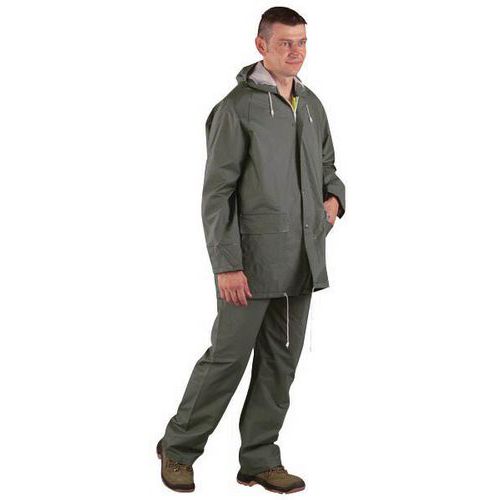 Waterproof jacket and trousers set with double coating (PVC cotton backing and polyester).