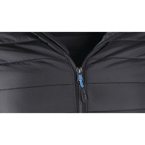 KX3 baffle work jacket with a contemporary design. Brushed, reinforced and lined fabric. Body shaped for better insulation and freedom of movement. Reinforced panels for better durability. Elastic hem and cuffs for comfort and warmth. Interchangeable pull tabs in blue, red and lime green provided for easy integration of corporate colours.