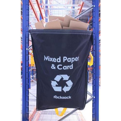 Choose from 6 printed designs on a blue sack. Delivers a simple, cost-effective system to keep you compliant with UK and EU waste segregation legislation. Can be put on most shelving/racking systems 900-1100mm deep with two strong S locators (supplied with each racksack). Designed to hang from end-of-aisle racking with an open ‘frog mouth’ to receive waste easily, yet its tapered design means it hardly encroaches on floor space. The design on the front states which type of waste should be deposited in the racksack®, allowing waste segregation to happen at the source. Three strong handles are woven into the edge of the sack, one on each side for carrying and one on the base, so it can be easily tilted from the base and emptied once full. Time and space-saving. The robust sacks are made of tough waterproof polyester. Call our sales team for more standard designs and bespoke company names or logos.