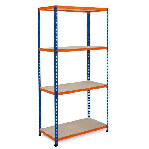 Rapid 2 Shelving (1600h x 915w) Blue & Orange with 4 Chipboard Shelves, including protective caps and feet Each chipboard shelf can hold up to 340kg Uniformly Distributed Load (UDL) Shelf depths under 610mm come with 15mm thick chipboard and depths of 610mm and over - 16mm thick chipboard 2mm thick heavy duty structural quality steel beam construction with a durable paint finish Slim beam profile maximises storage space Fast boltless assembly - All you need is a heavy duty mallet, available separately Adjustable shelves - Every 38mm All shelves can be accessed from any side as no stability bracing is required Available in a range of heights and widths Tested to FEM - Suitable for daily use in an industrial environment 30 Year Guarantee Remember to order tie plates for joining additional bays Can be fitted with additional shelf levels Shelving accessories include: mesh cladding, notice plates, retaining hoops and labelling.