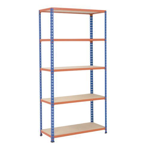 Rapid 2 Shelving (2440h x 915w) Blue & Orange with 5 Chipboard Shelves, including protective caps and feet Each chipboard shelf can hold up to 340kg Uniformly Distributed Load (UDL) Shelf depths under 610mm come with 15mm thick chipboard and depths of 610mm and over - 16mm thick chipboard 2mm thick heavy duty structural quality steel beam construction with a durable paint finish Slim beam profile maximises storage space Fast boltless assembly - All you need is a heavy duty mallet, available separately Adjustable shelves - Every 38mm All shelves can be accessed from any side as no stability bracing is required Available in a range of heights, widths, depths and colours Tested to FEM - Suitable for daily use in an industrial environment 30 Year Guarantee Remember to order tie plates for joining additional bays Can be fitted with additional shelf levels Shelving accessories include: mesh cladding, notice plates, retaining hoops and labelling.