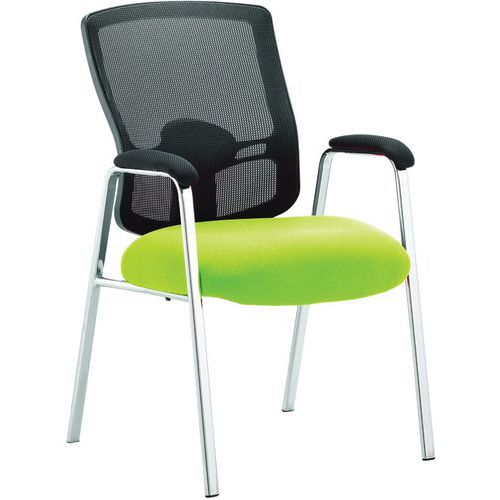 High-density soft moulded bespoke fabric seat. High mesh back. Adjustable lumbar support. Soft padded armrests. Chrome four-legged frame.