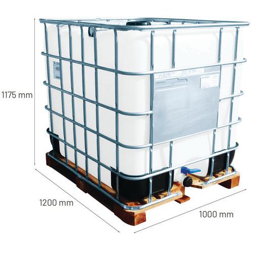 | Product Name | Reconditioned and approved 1000-l transport container + pallet, Capacity: 1000 L, O/A height: 1175 mm |