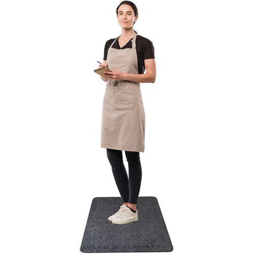 The carpet top is a smart cut-pile surface that blends in with modern interiors. Foam base layer relieves the discomfort of prolonged standing and stimulates movement to support circulation. Made from ECONYL®, a recycled nylon material made from things like discarded fishing nets. Exceptionally durable. Adds an extra layer of comfort and helps to delay the onset of pain and tiredness from standing on hard or firm floor surfaces. Bevelled edges and rounded corners reduce the risk of trips. Ideal for offices, receptions, hospitality front of house, and domestic use. Made in the EU