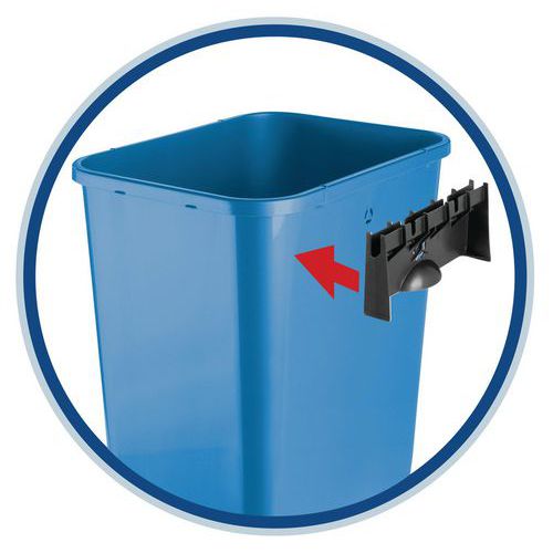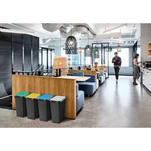 Bin for recycling waste (paper, plastic, glass, organic waste). Compact rectangular shape. Lid with two opening systems: push or swing. Hooking system provided. Allows you to secure the bins together to form an island. Suitable for use with 50-l bin bags. Available in various colours.